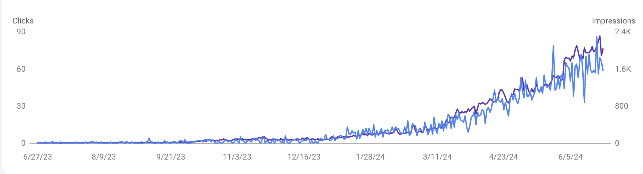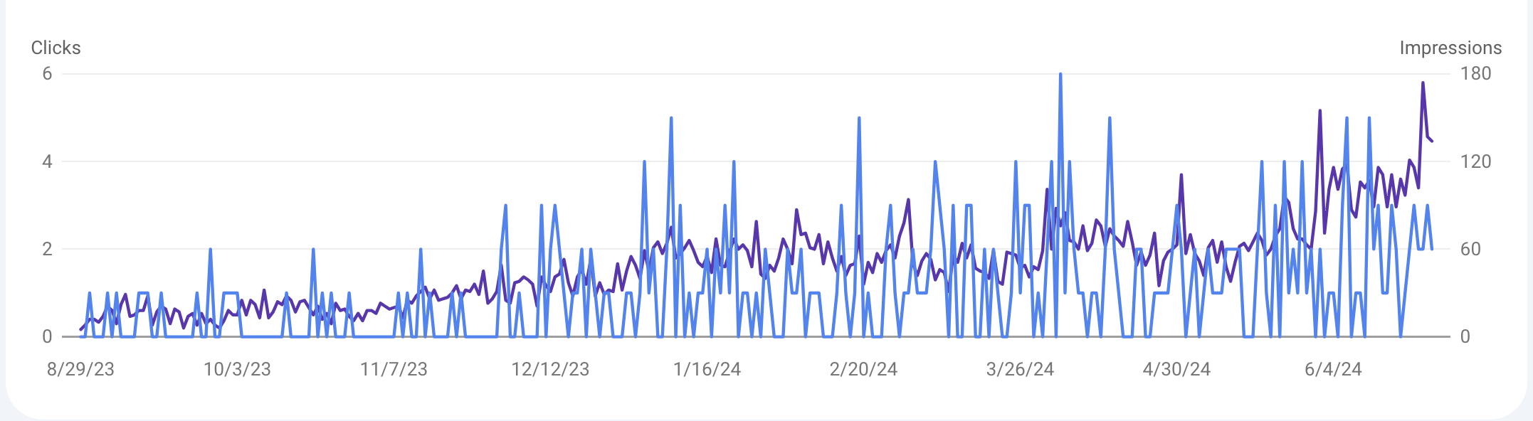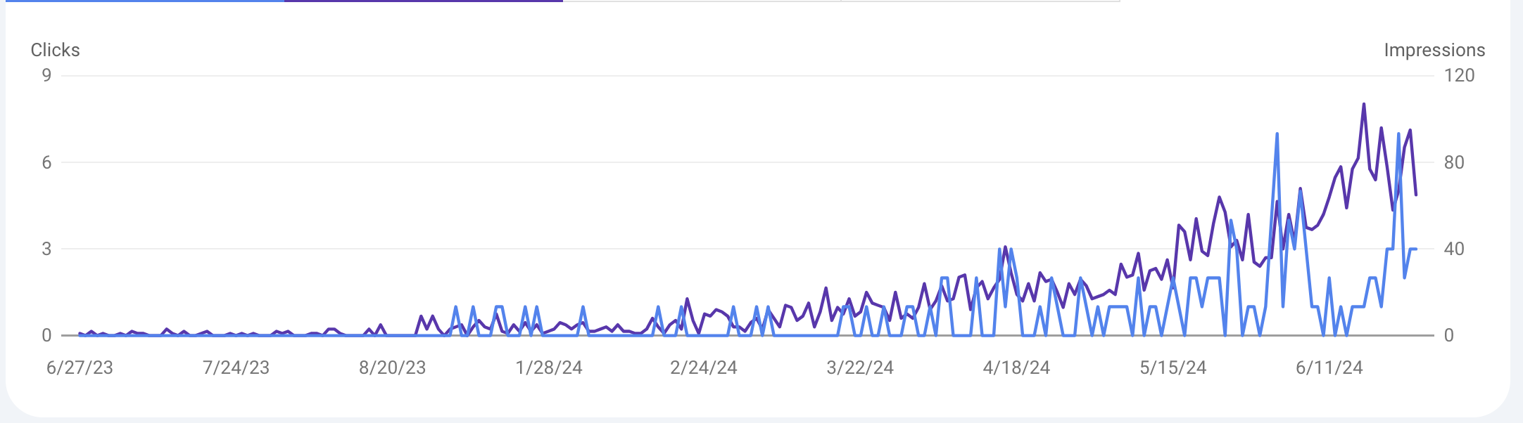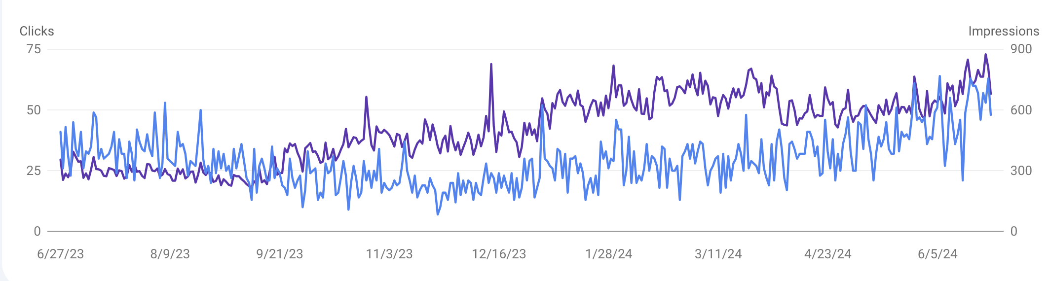 The purple line are impressions from Google’s Search Engine Result page. The blue line are clicks.